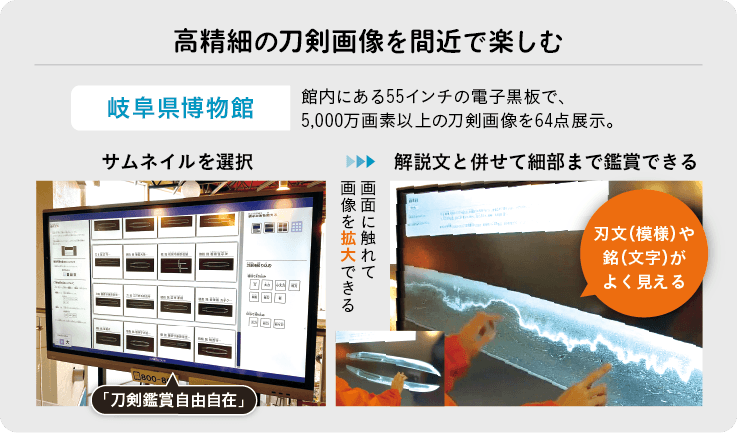 岐阜県は、室町時代末の戦乱期に日本刀づくりが盛んだった地域。同館では、郷土資料として多くの刀剣を所蔵している。一方で、恐竜化石の出土が多かったことから、恐竜のコンテンツも充実しているという。そんな中、ゲームが火付け役となり刀剣ブームが始まった。ファン層の拡大などを受け、平成30年には刀剣の特別展を開催。以来、恐竜と並ぶ目玉にすべく、展示の充実を図っている。そこで考えたのが、特別展の図録制作などで撮影した、高精細画像の活用だ。「実は、刀剣の展示・鑑賞には多くの課題があります。まず、実物資料はスペースの関係上、たくさん並べることができません。さらに本来は、部分的に光を当てる角度を変えながら鑑賞するのですが、ケースに入れた状態ではそれができず、見どころが伝わりにくくなります。そのため初心者にも分かりやすく、楽しめるような展示がしたいと思っていました」と、学芸員の南本さん。