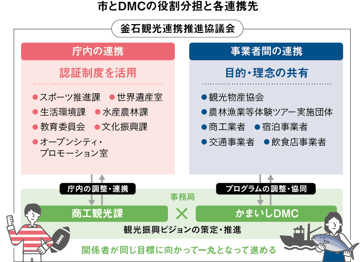 アイデアを形にするため、平成30年に観光地域づくり法人「かまいしDMC」を設立。同市と二者体制で事務局を運営している。「DMC※1が民間事業者の取りまとめをして、コンテンツの作成や提供を行っています。市では商工観光課が中心となり、各部署の横のつながりを調整するというように役割分担をしています」。令和3年には多くの関係者でつくる「釡石観光連携推進協議会」も設立し、連携強化を図っているそうだ。