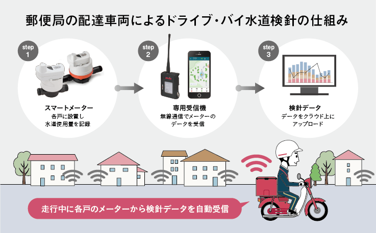 水道検針は目視が主流だが、郵便局の配達車両に受信機を搭載し、対象地域付近を走行することで検針が可能となるサービスが開発された。異業種協業で人手不足を補うだけでなく、コストダウンも図れるという。