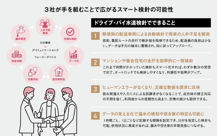 平岡さんから協業の提案を受けた岩本さんは、「スマート検針に必要な“人手”を日本郵便が担ってくれれば、コストパフォーマンスもいい。不足を互いの強みで補い合う異業種協業は、今の時代にマッチしたやり方です」と快諾。こうして、3社協業の水道検針ソリューションが生まれた。