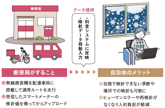 寒冷地では人手不足に加え、積雪で検針が困難になることから、配達ネットワークをもつ日本郵便に業務委託。積雪のない時期と、最も多い時期に検針を行い、寒冷地においても検針可能か、効率化できるか、データは正確かなどを検証する。