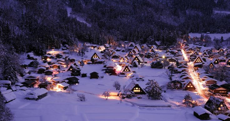 「白川郷ライトアップ」は、昭和の時代から続く恒例行事。雪に覆われた合掌造り集落が闇に浮かぶ幻想的な光景が、日本のみならずアジアからの観光客も魅了する。夜の白川郷を観光できる貴重な機会でもある。