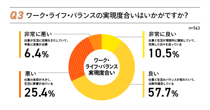 ワーク・ライフ・バランスの実現は「非常に良い」「良い」が計68%に達したが、残る3割強は仕事が生活に負担を与えていると感じている。