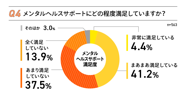 メンタルヘルスサポートについては過半数の51%が「満足していない」と回答しており、一部で対策の遅れがうかがえる。