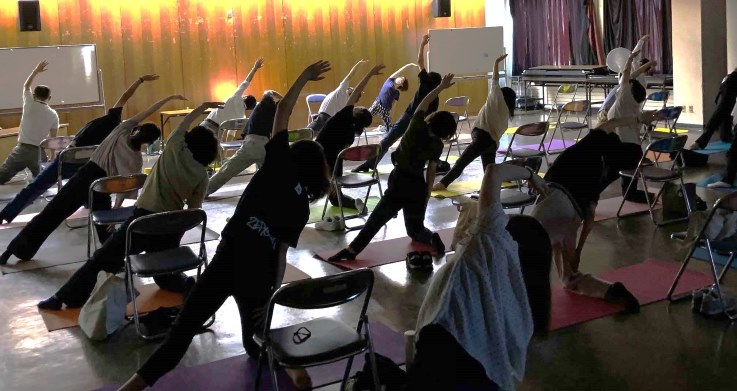 ▲ ヨガの研修を受ける苫小牧市職員。ヘルスリテラシーの向上を目指す取り組みの一環だ。