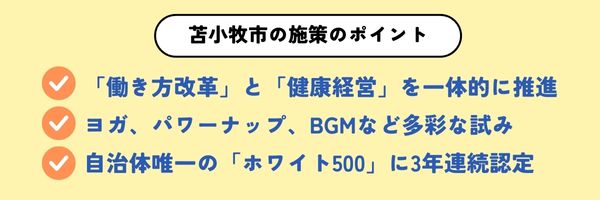 独自の健康経営宣言をもとに、働き方改革と健康経営を一体的に推進している苫小牧市。その成果が評価され、優良法人を認定する「ホワイト500」に3年連続で選出されている。具体的な取り組みの内容を担当者に聞いた。