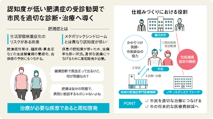 ちょうどその頃、市内の肥満症専門医から「一緒に肥満症の周知啓発事業に取り組みたい」といった提案を受けた。「当時は私もその病気を知らず、治療を要するものだという認識もありませんでした。話を聞くと、製薬会社であるノボノルディスクファーマ(以下、NNPL)と協働し、肥満症対策として病気の啓発や受診勧奨を行う新たな事業でした」。