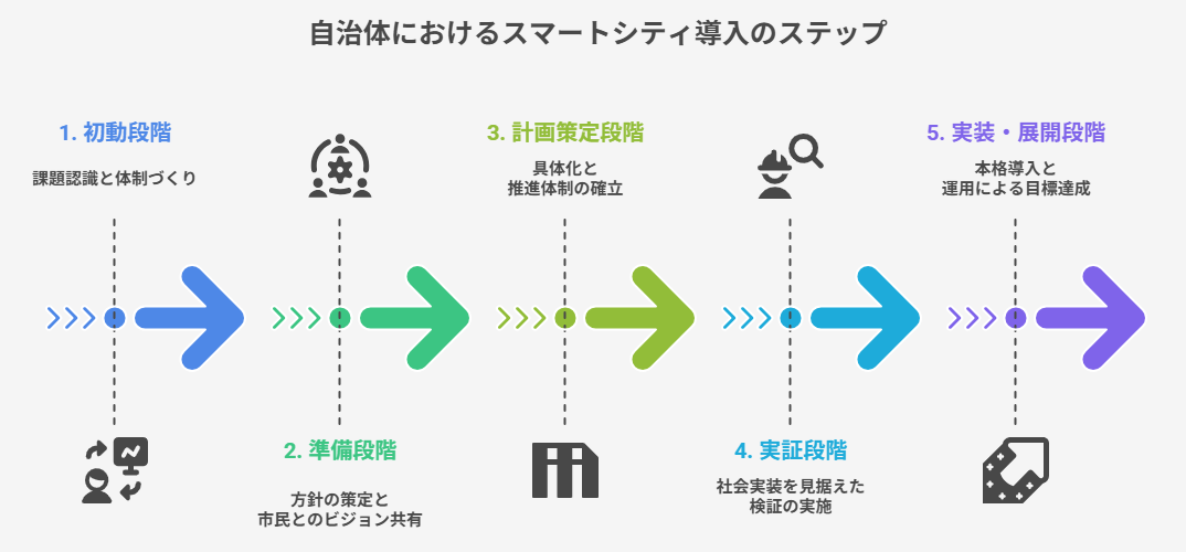 スマートシティの実現には、自治体が主体となり、段階的に取り組むことが重要である。一般的には上記の5つの段階を経て、地域課題やビジョンに応じたスマートシティの構築が進められる。