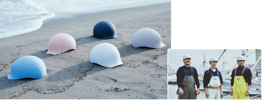 このヘルメットは、新品プラスチックを使用する場合と比較して、最大36%の二酸化炭素削減効果があるという。また、貝殻を約50%混ぜることにより強度が約33%向上。さらに、デザインにはホタテ貝殻のリブ構造を取り入れた“バイオミミクリー※” 技術を採用し、耐久性を高めている。「プラスチックはヘルメットに限らず使える素材です。再生プラスチックとして、様々なものに転用ができるのでは」と阿部さんは期待を込める。ホタメットは、大阪・関西万博の防災用公式ヘルメットとしても導入予定だ。