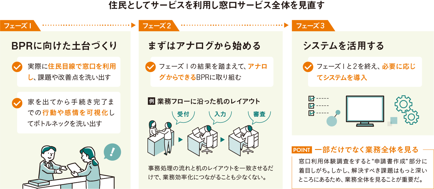 窓口BPRとは自治体窓口の利用体験調査を実施し、フロントヤードとバックヤード双方の課題を抽出。窓口サービスを改革する取り組みです。成功する自治体は推進体制が整い、職員が楽しんで改善に携わっています。反対に現状の把握を行わず、課題解決をシステム導入だけに頼る自治体はつまずく傾向です。