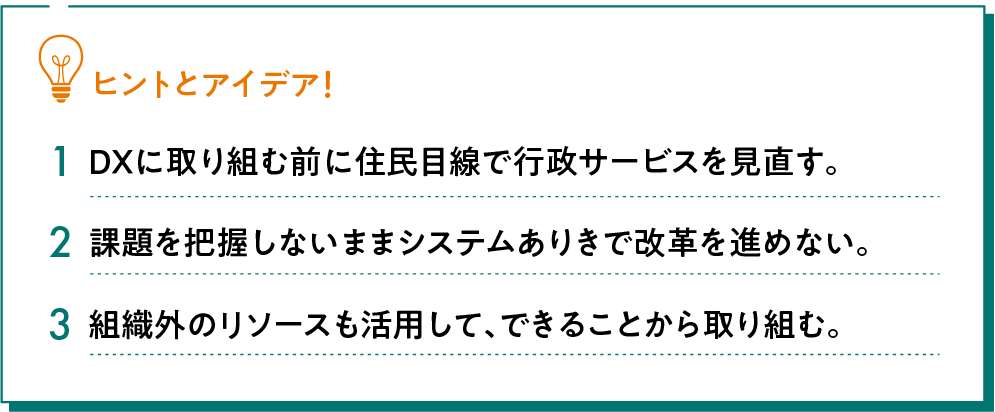 また、一気に進めるのではなく、一貫して続けることを意識してほしいですね。ある自治体では窓口改革の取り組みを10年以上継続していて、システム活用ができる手続きを今も増やしつづけているそうです。