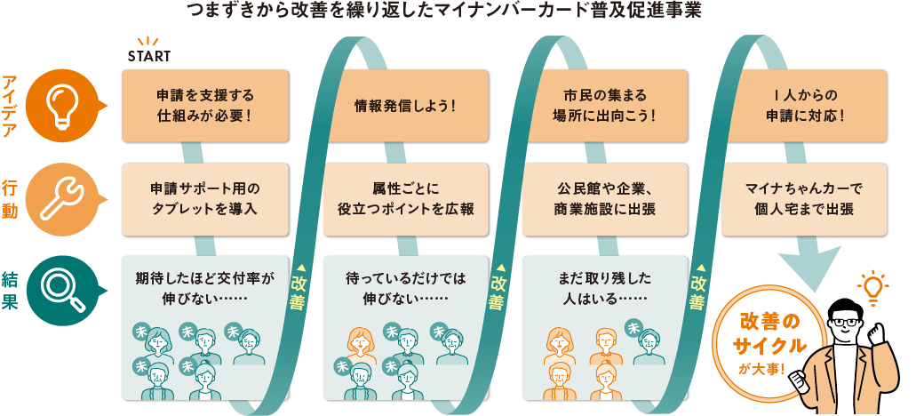 それでも、待っているだけでは交付率が伸びないことも分かり、公民館や企業、ショッピングセンターなど市民が集まる場所に出張。実際に顔を合わせて不安や疑問に答えることで、理解も深まったと思います。交付率が70%に近づいた頃には、1人からの申請にも対応するため、手続き用の車両“マイナちゃんカー”で個人宅に出向きました。