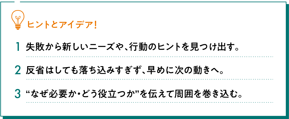 うまくいかないことがあるたび、即座に改善を行いました。想定外やつまずきは“新しいめ(芽・目)”だと捉えています。これまで見えていなかったニーズへの気づきになり、次の動きにつなげられる。このサイクルが大事だと思います。