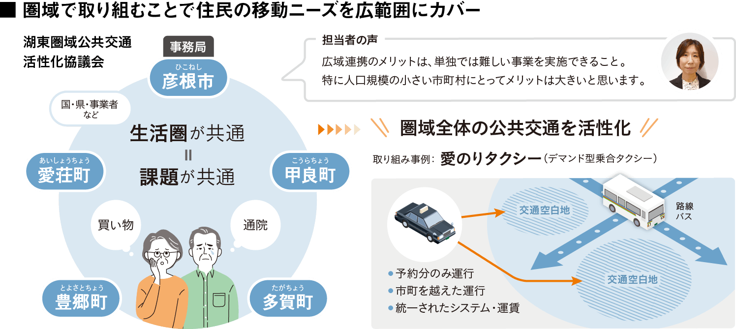 平成21年、同市は各町と「湖東定住自立圏形成協定」を締結。定住に必要な生活機能を確保しつつ、様々な分野において広域的に連携することで地域活性化を目指したという。「この協定にもとづき、公共交通分野では1市4町の職員や運輸支局、県の交通担当部署、警察署、公共交通の運行事業者、各市町の住民代表、学識経験者などで構成する『湖東圏域公共交通活性化協議会』が設立されました。以降は協議会を中心に、路線バスの実証運行やデマンド型乗合タクシーの運行、公共交通の利用促進に向けた情報提供やアンケート調査など、湖東圏域全体をより便利にするための事業や協議を行っています」。