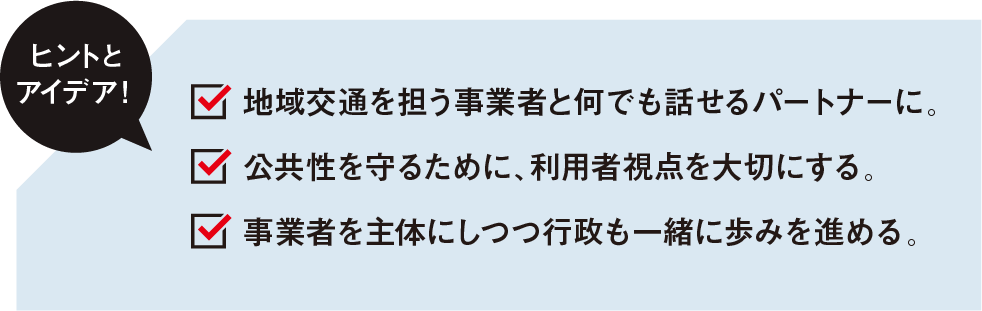民間主導だと、どうしても限られた人材や車両などの資源を取り合う構図に陥りがちだが、行政が連携することで、利用者視点で調整を行えるメリットがあるという。「基本的には事業者が主体となって取り組んでいます。会議では様々な企画や意見が出ますが、行政は利用者の立場を意識して参加し、推進室の方針がぶれないように調整しています。この組織があることで、私たちも取り組みの過程を把握できますし、県や市の施策とも連携しやすくなります。全体を見渡す視点をもつことが、スムーズな連携のポイントなのかもしれません」。