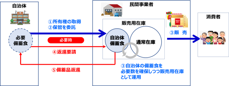 (1)自治体側が備蓄食物資を共同購入し、所有権を取得する(2)物資は事業者が倉庫で保管し、自治体側は管理手数料を支払う(3)平常時は事業者が物資を販売用在庫として運用する(4)(5)災害時は自治体に物資が返還される、という仕組みだ。