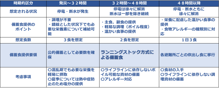 特に賞味期限の問題が解消することで、備蓄用の特殊な食品を用意する必要がなくなり、購入費用は従来の1人当たり1,000円から330円に削減。防災対策費が大幅に圧縮できるという。発災直後のための備蓄食は自治体で確保する必要があるが、その後の食事をこのランニングストック方式でまかない、発災2日後からは避難所ごとの炊き出しに移行する想定だ。
