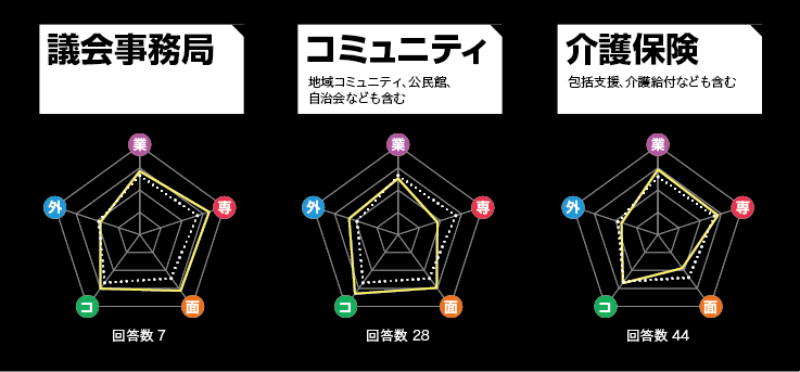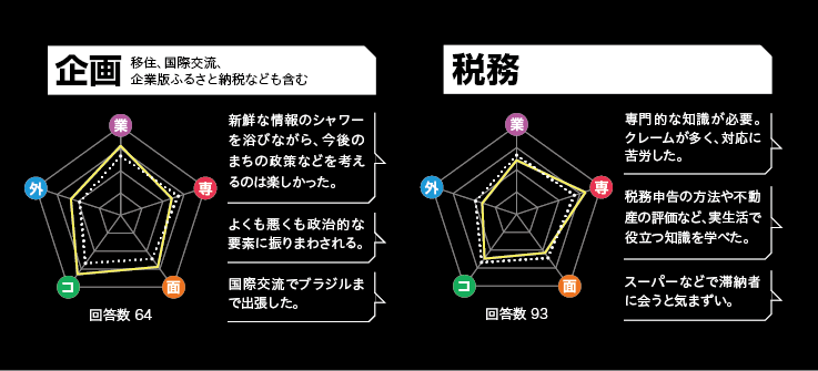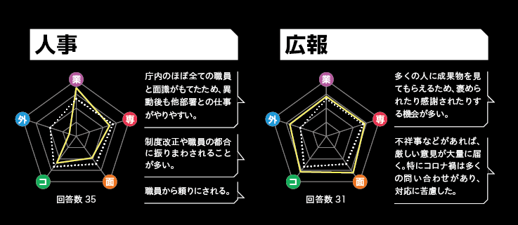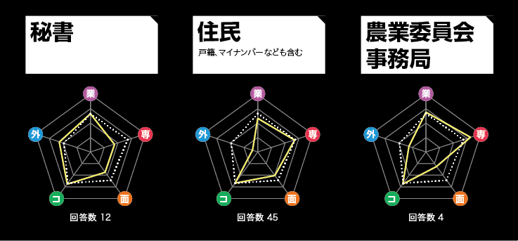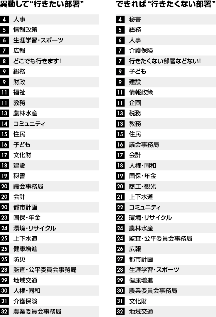 ※当企画における部署分類:農林水産/議会事務局/情報政策/コミュニティ/介護保険/総務/商工・観光/企画/会計/監査・公平委員会事務局/生涯学習・スポーツ/税務/人事/広報/子ども/国保・年金/上下水道/福祉/財政/教務/建設/健康増進/環境・リサイクル/文化財/地域交通/都市計画/人権・同和/防災/秘書/住民/農業委員会事務局