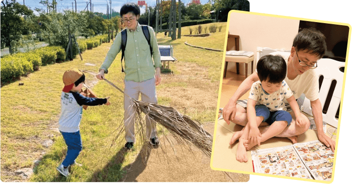 A. 令和2年度に初めて育休を取得しました。当時、育休を取る男性職員は少数でしたが、より近くで子どものことを理解したいと思い、取得しました。想像以上に大変な日々でしたが、しっかりと育児・家事に向き合う経験ができてよかったです。復帰後に大変なのは、突発的な子どもの体調不良。共働きなので、妻と調整して対応しています。コツは業務予定を詰めすぎないこと。スケジュールには空白の予定を入れておき、後から調整しています。また、家事をしながらポッドキャストを聞いたり、通勤時に読書したり、限られた時間を有効活用しています。