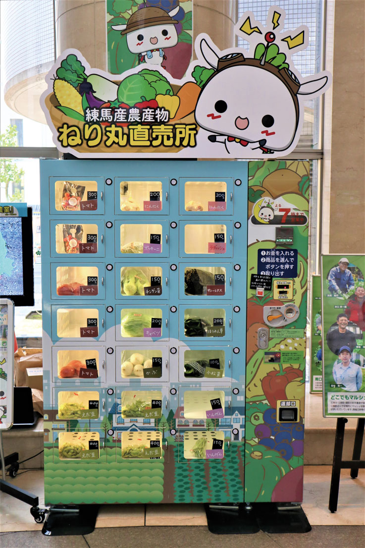 区役所内に設置された1台の自動販売機。コインロッカー式で、中には採れたて野菜や果物、区内農産物を使った加工品などが並ぶ。練馬区が令和3年に導入し、注目されているのが、農産物自動販売機「ねり丸直売所」だ。