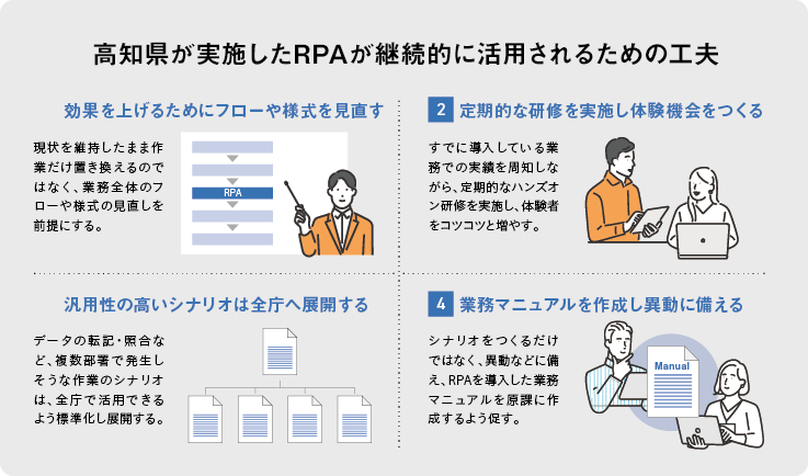 こうした現場での展開と同時に、RPAに関する研修も定期的に実施。事業者はこれら一連のプロセスを伴走支援している。併せて同県では、業務の見直しなどに関する研修も実施し、人材育成にも余念がない。