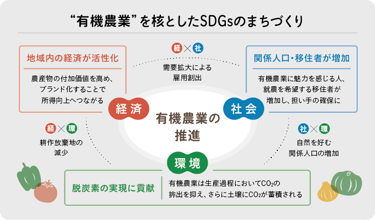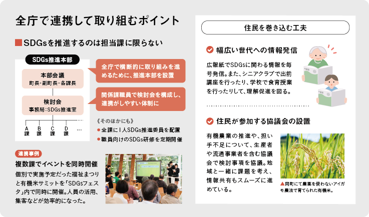 有機農業では化学肥料などを使わないため、環境負荷の軽減や生物多様性の保全に貢献できる。さらに、農産物の付加価値を高めてブランド化することで、所得の向上にもつながっていく。そうしてまちのブランディングができれば、町外から有機農業に関心のある人を呼び込めるだろう。「有機農業の推進を核にしたまちづくりは、環境・経済・社会で複合的に取り組もうとするSDGsの考え方と合致していました。そこで、SDGs未来都市計画を策定し、農業だけにとどまらない取り組みを進めていったのです」と松永さん。庁内には部署を横断したプロジェクトチームを発足させ、活動を拡大していったという。