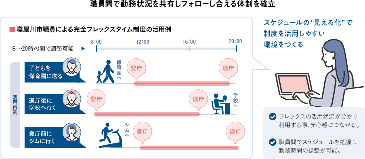 同市では、1カ月の総勤務時間の範囲で1日ごとの勤務時間を設定できる。制度の導入にあたり、“職員自身で働き方を決定すること”“業務量に応じて働き方を調整すること”をルールとして設定した。人事室からはこの2つを徹底するよう、職員に呼びかけているという。「就業時間は8~20時の間で、1日当たりの勤務時間は最短15分、最長11時間で調整可能です。コアタイムを設けていないので、勤務時間や休憩時間の長さを自由に決めることができます。夜間だけ、早朝だけの勤務も可能で自由度が高いです」と下村さんは話す。勤務管理システム上で申請すれば、公務に支障がない限り上長によってそのまま承認される。また、互いの勤務状況を確認できる仕組みがあり、このスケジュールの“見える化”が、制度を利用する後押しになったそうだ。