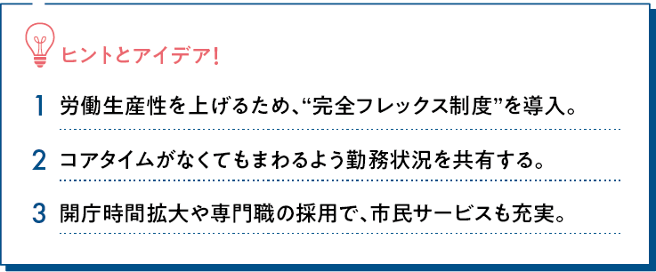 制度導入を発表した令和元年の採用試験では、応募者数が例年の10倍以上に増加したそうだ。「働きやすい環境を決め手に志望したという応募者の声を多く聞きました。当市の独自性や魅力が確立され、庁外にも認知されていると実感しましたね」と西村さんは話す。また、開庁時間の延長に伴う夜間窓口については、“窓口に行くために仕事を休まずに済む”“予約制なので待ち時間が減った”など、市民からの反響もあったという。