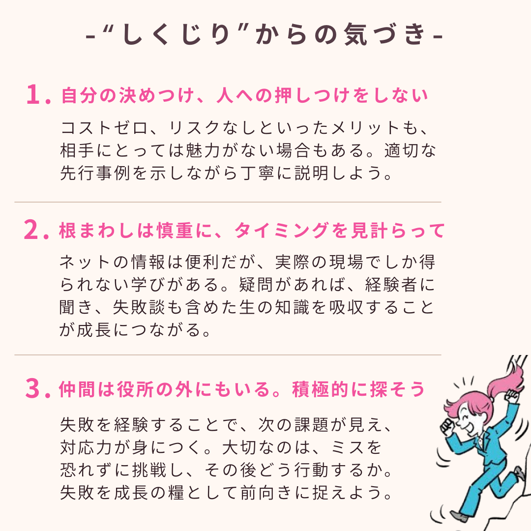 誰にとっても失敗は怖いもの。「できることなら挑戦せず、現状維持でいきたい‥…」と考える人は、決して珍しくないだろう。本特集では、現役の自治体職員が経験した“しくじり”と、そこから得た気づきをご紹介。