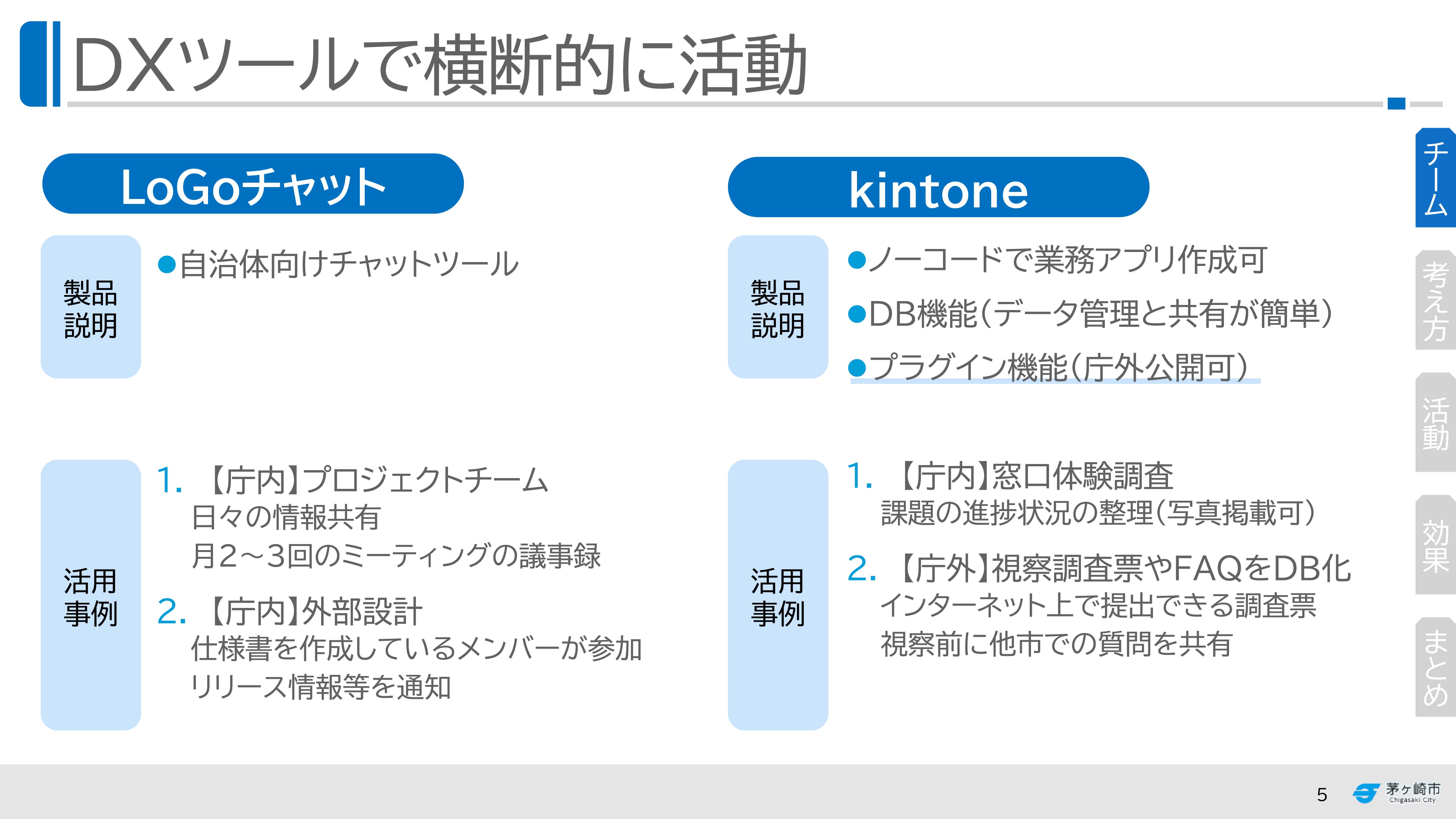 このプロジェクトチームでの取り組みを通常業務と並行して進めるとなると様々な制約もあるので、限られた時間の中で効果を出すために、庁内チャットツールを積極的に活用して効率化を図りました。