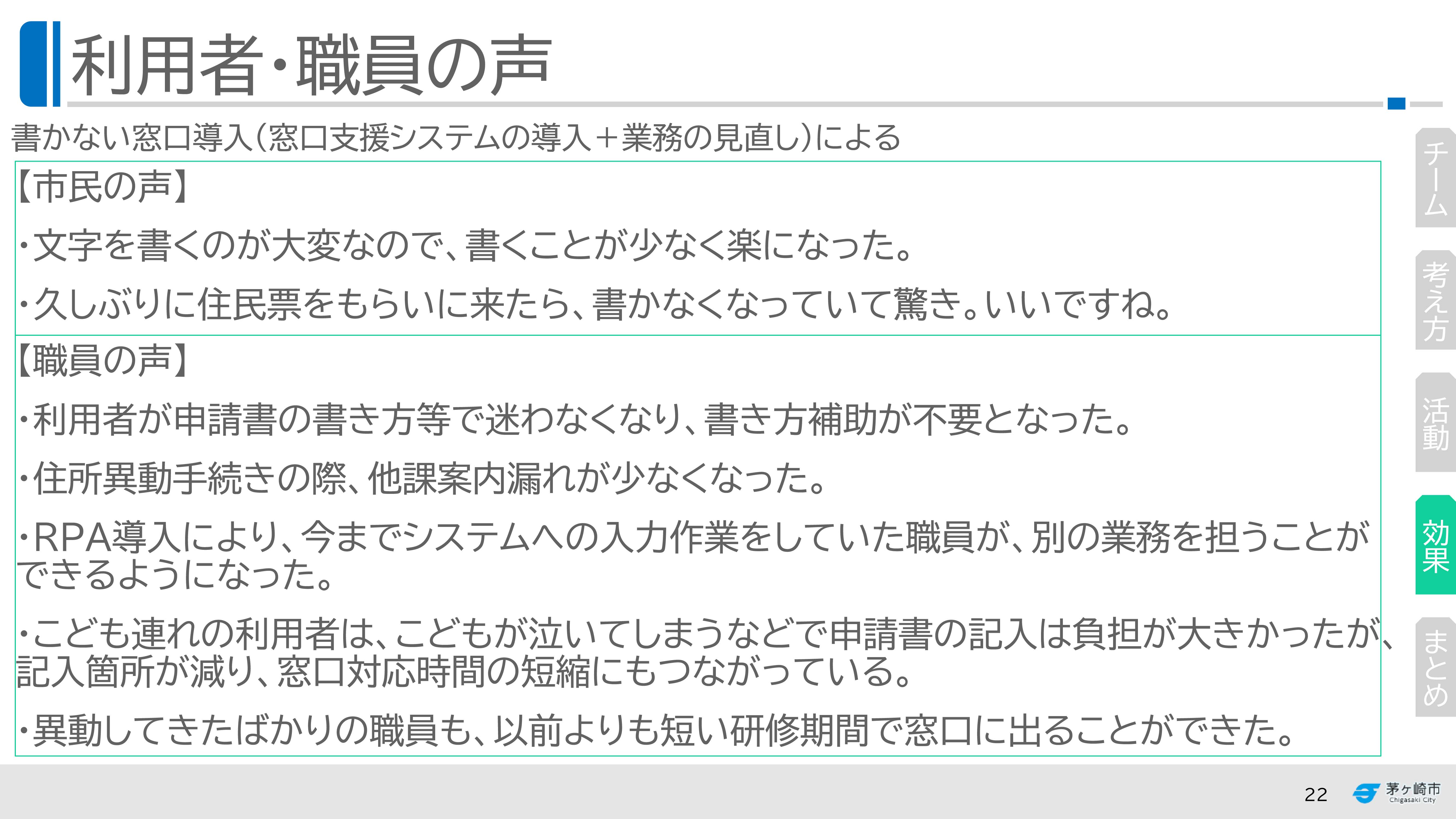 処理時間については、純粋に処理する時間で比較すると、住民票発行も住民異動も、6分30秒削減することができています。昨年の2月には満足度アンケートを実施しました。結果は、5段階評価で平均4.87という評価をいただいています。今年度も、12月から1月にかけてアンケートを行っており、4.9という評価でした。利用者、および職員の声は以下のような内容です。