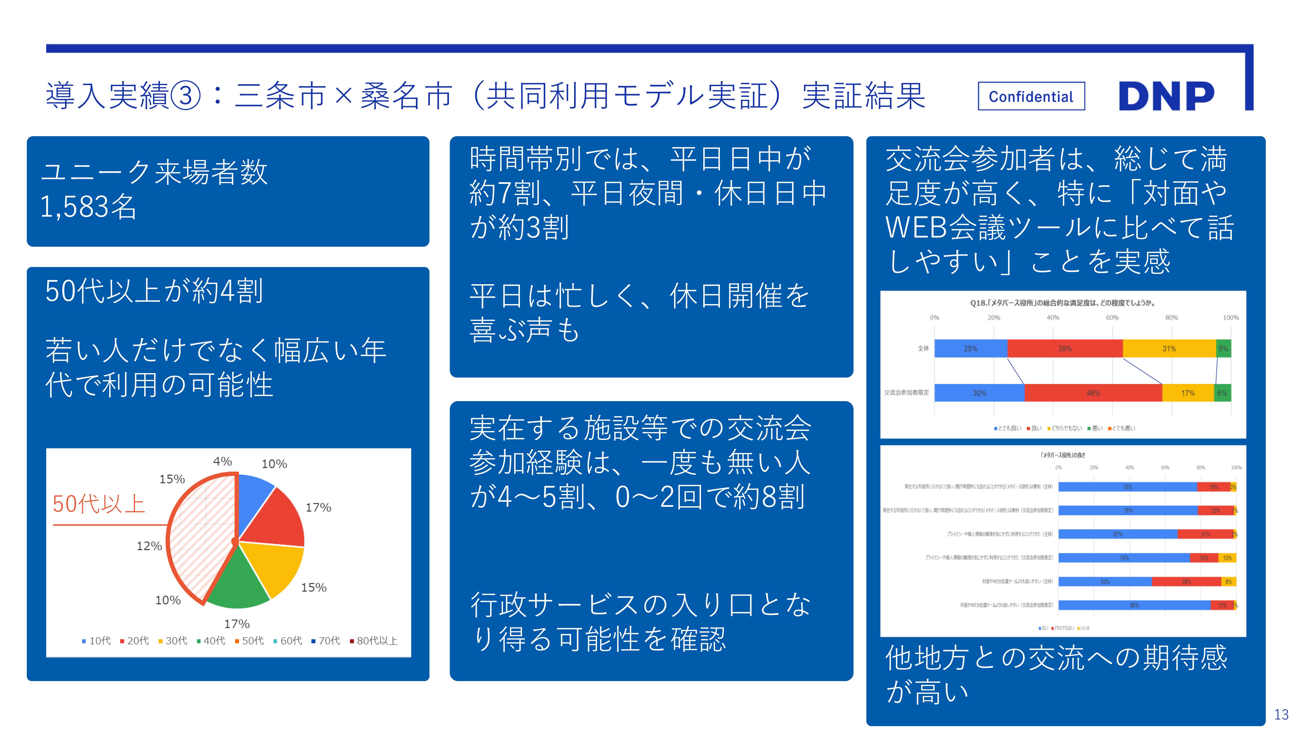 また、江戸川区ではメタバース役所の先行運用を行っています。江戸川区役所を再現した空間をメタバース上につくり、ここで相談や案内を行うといったことを実施。さらに、三条市と桑名市では、メタバース役所を個別につくるのではなく、共同利用しようというモデル実証も行いました。結果として以下のような実績が上がっています。
