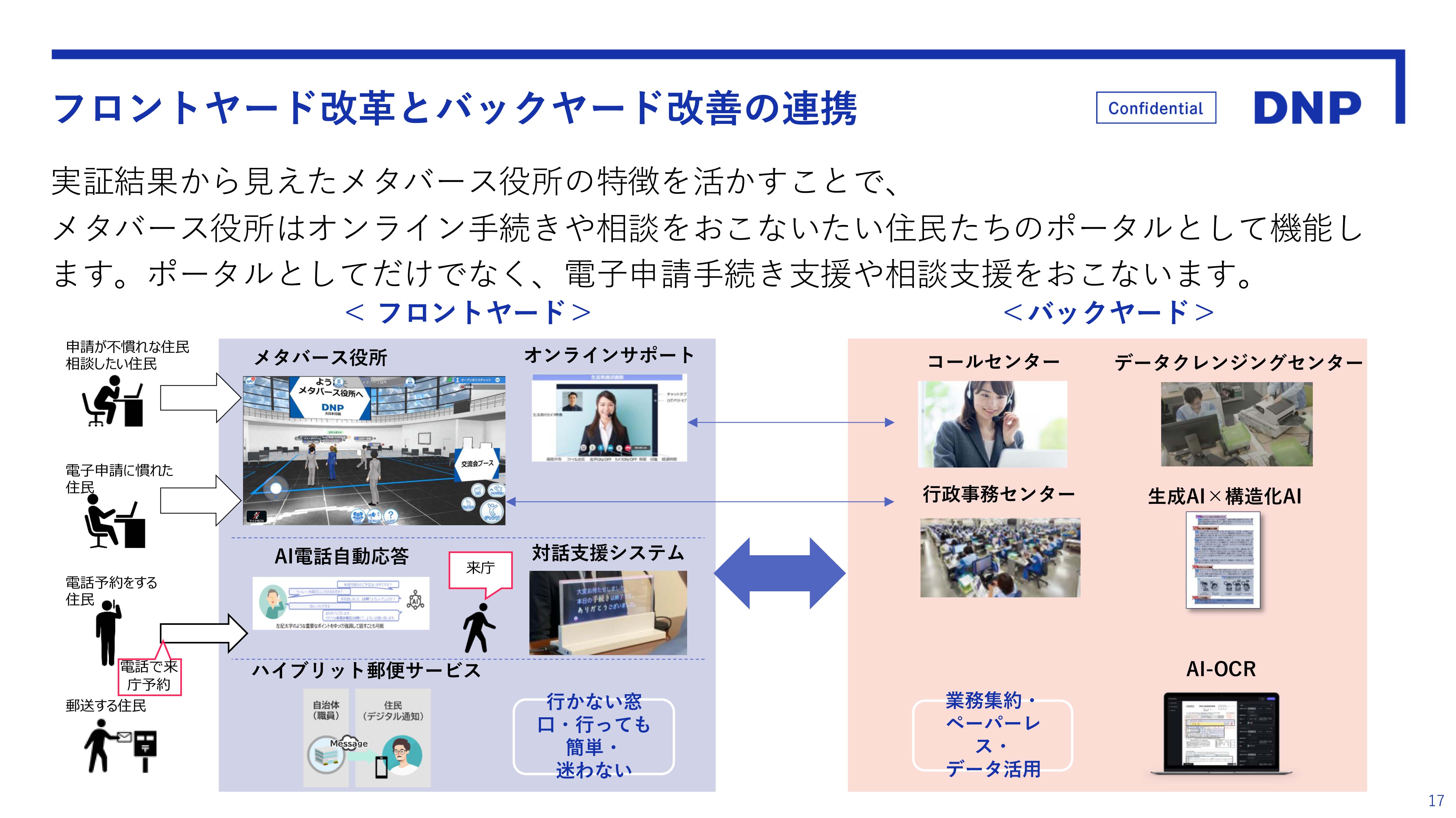 このメタバース役所を実現することで、24時間365日、相談ができる、手続きが出せる、そして出した手続きはバックヤードで電子処理され、一元管理していくことを目指しています。