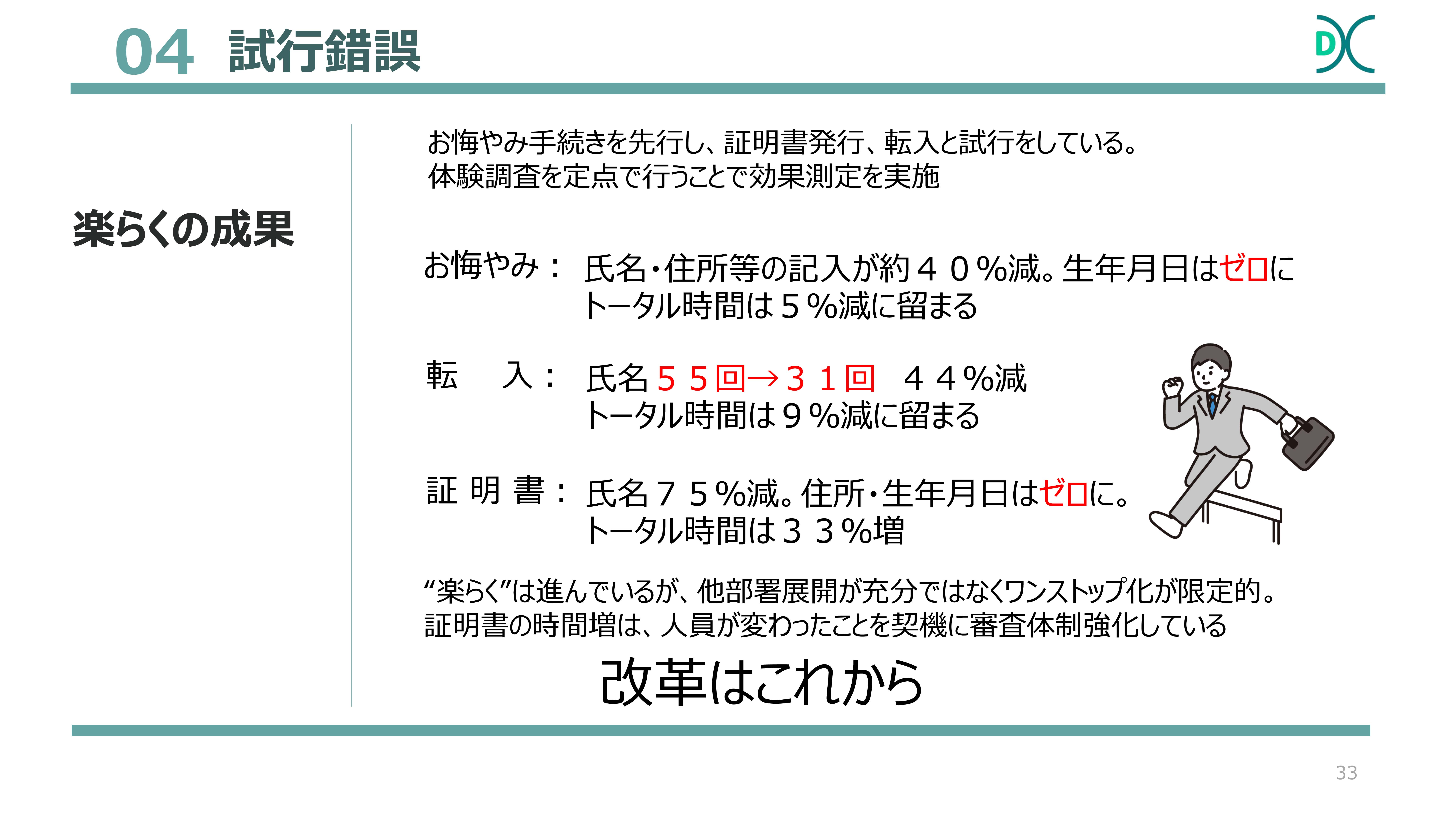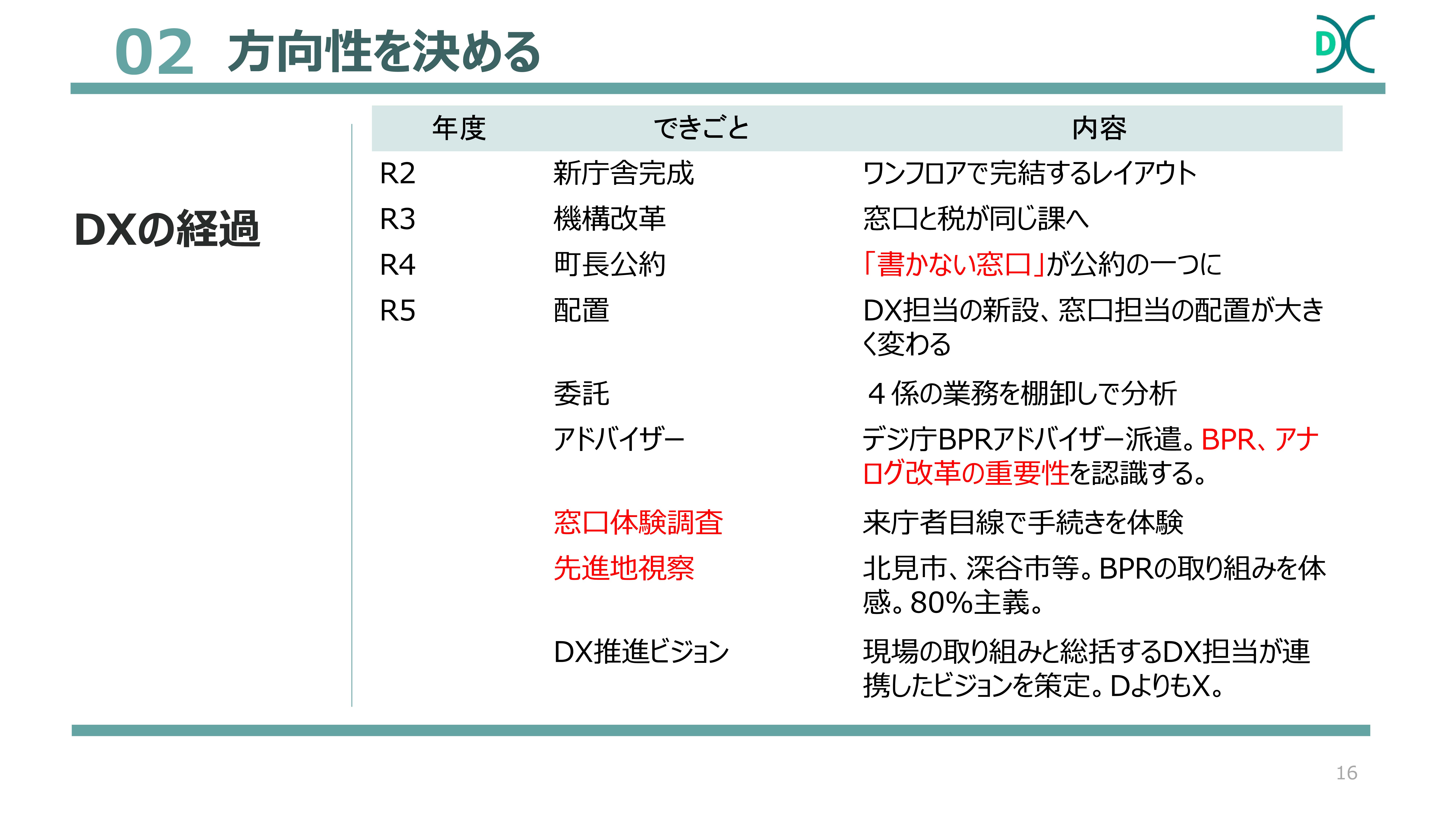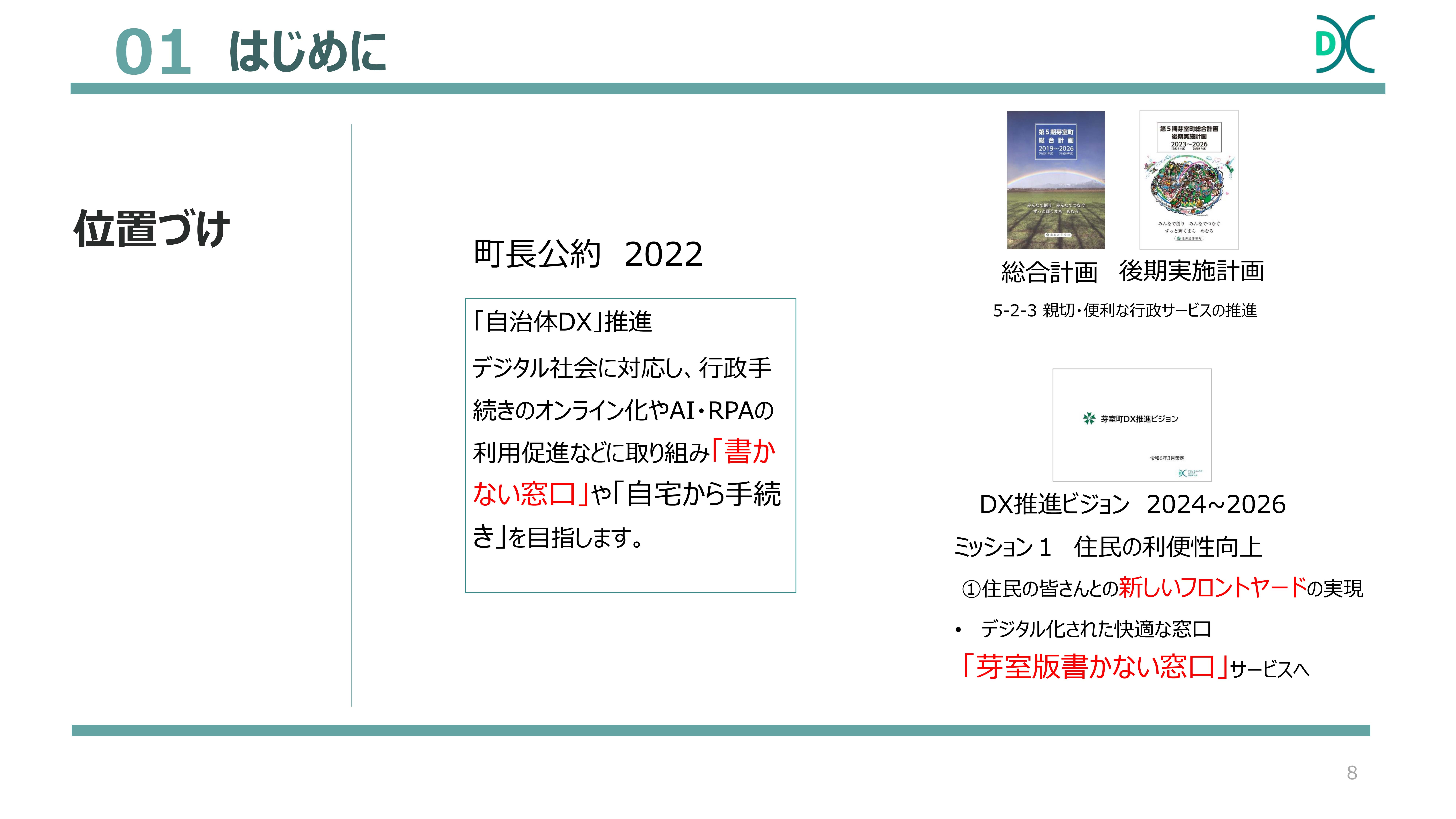 我々の方向としては、「DよりもX」ということで、トランスフォーメーションを重視していく考えです。アナログも含めた改革を進め、来庁者と職員の双方が楽になることが重要。この芽室町書かない窓口を「楽らく窓口」と名付けて進めています。