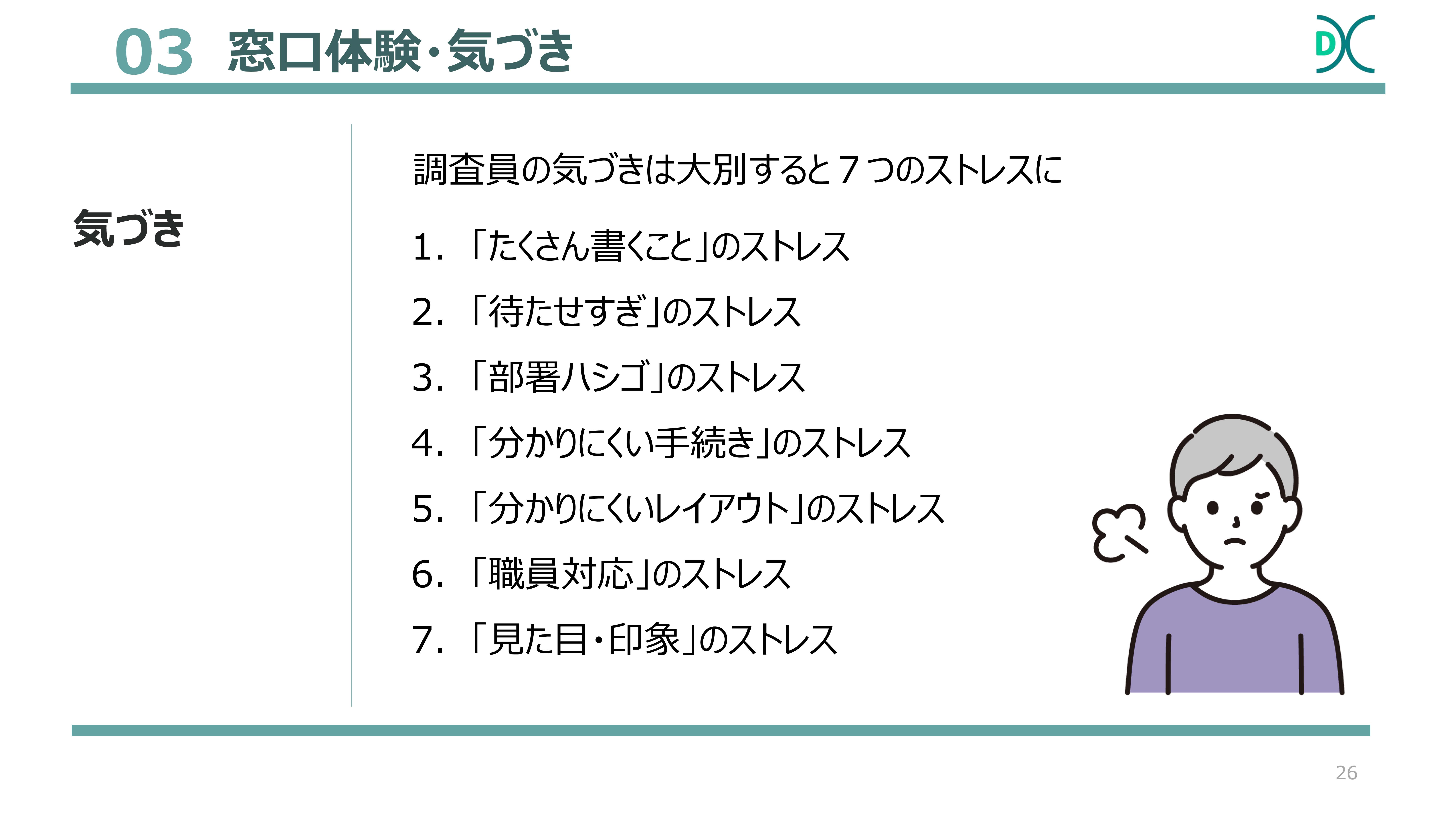 調査では、職員が窓口で一連の手続きを体験します。まず転入手続きのペルソナを設定。5人家族が転入してきたという想定で体験調査を実施しました。すると、氏名を書いた数が55回もあった。全体の所要時間は2時間18分でした。他にも、おくやみの手続き、証明書発行などの体験も実施しています。この体験調査の後にワークショップやヒアリングなどを行い、気づき・課題として上がってきたものが以下です。