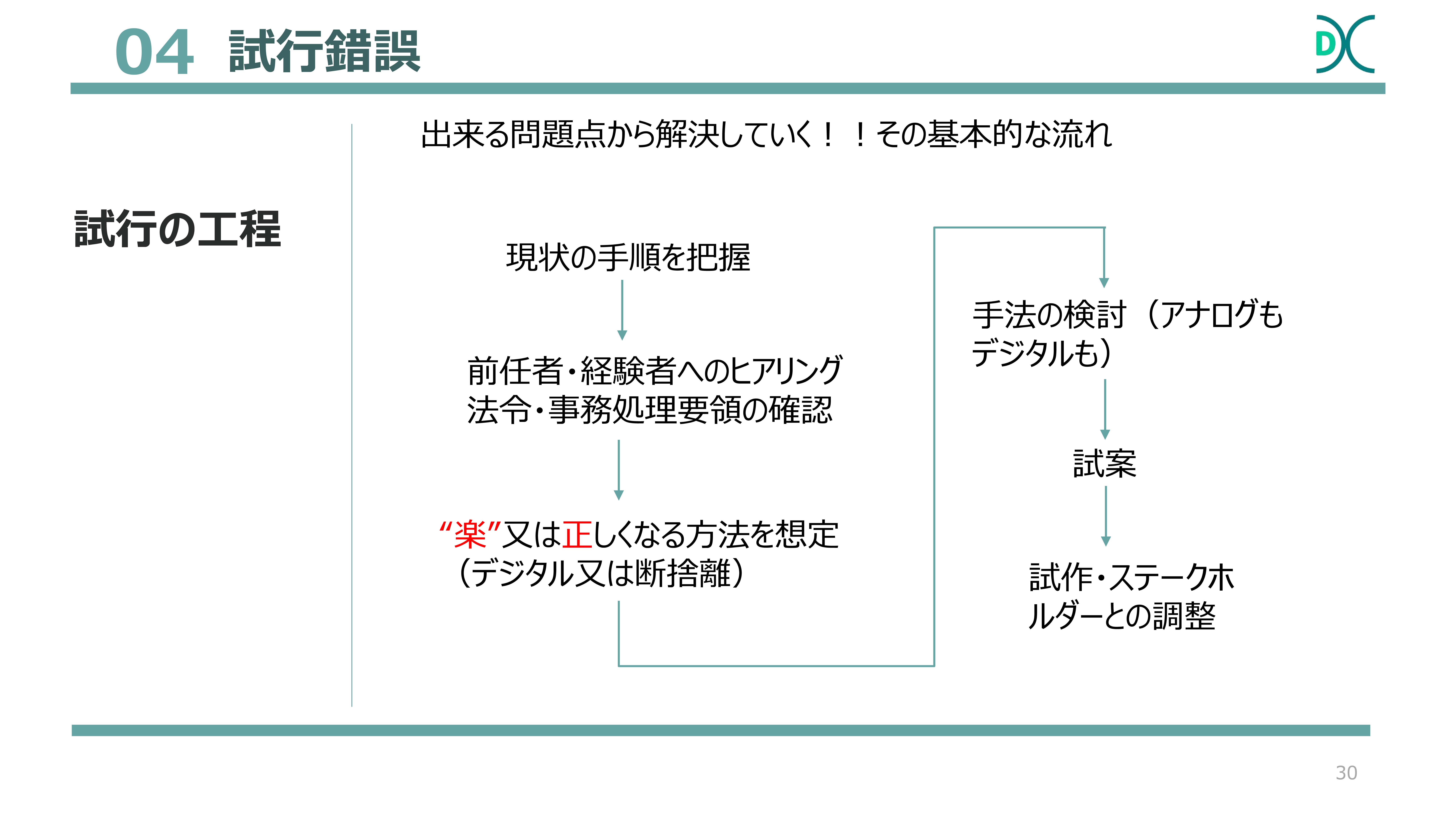 これらの非効率的な部分について、各担当者には「ムダなことをしている」という意識がなく、前例踏襲ゆえの思い込みがある。ここを洗い出すことが重要です。その上で効率化の手法を想定して、デジタル化や断捨離などに進みます。スモールスタートならやり直しも可能ということで、試案をつくり、調整をかけていきました。