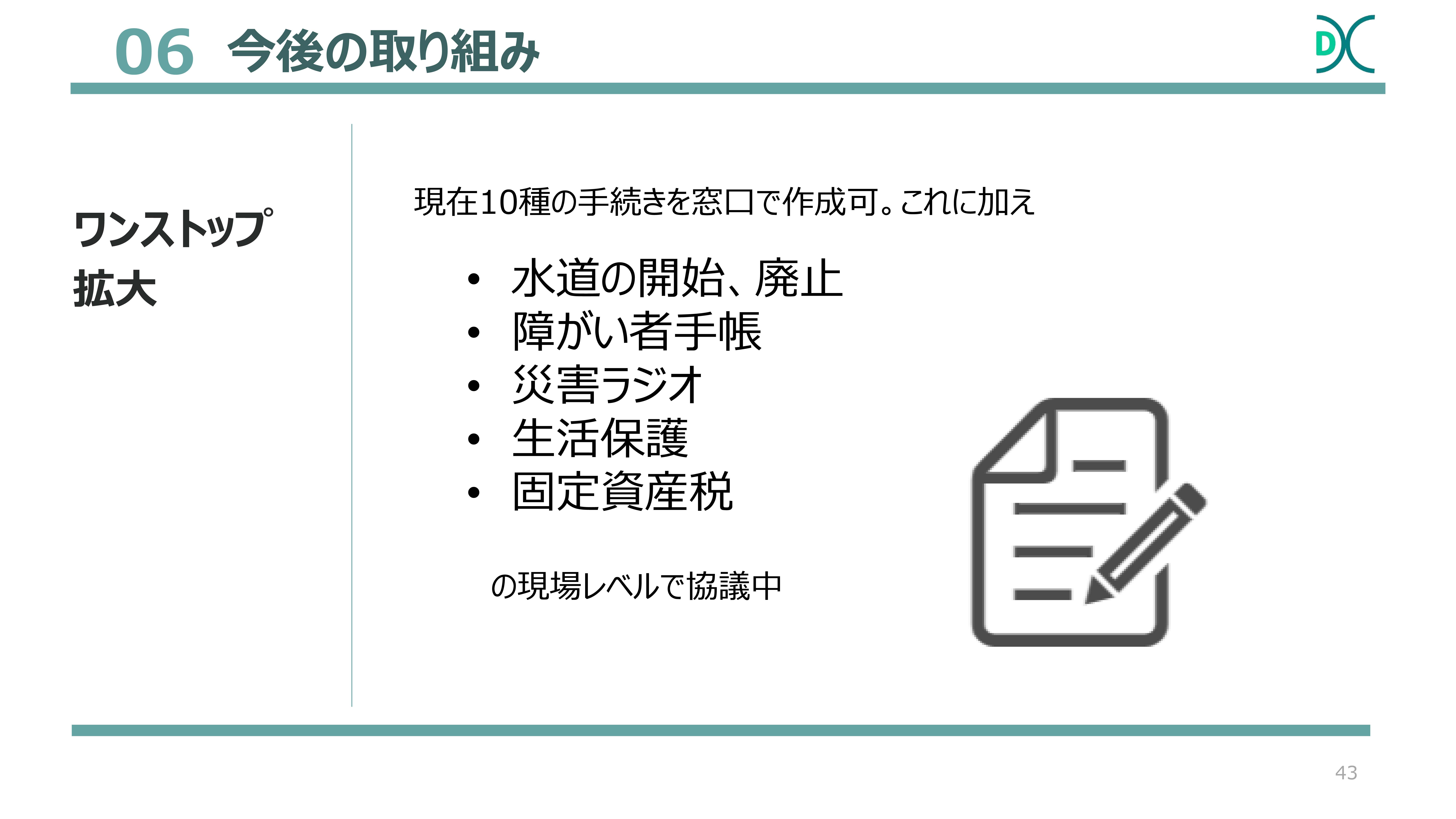 ワンストップの拡大という点では、現在10種類程度の手続きで実現できていますが、他にも広げられる余地があるので、現場レベルで協議中です。そして、書かないだけではなく、行かなくていい窓口をつくっていこうと考えています。