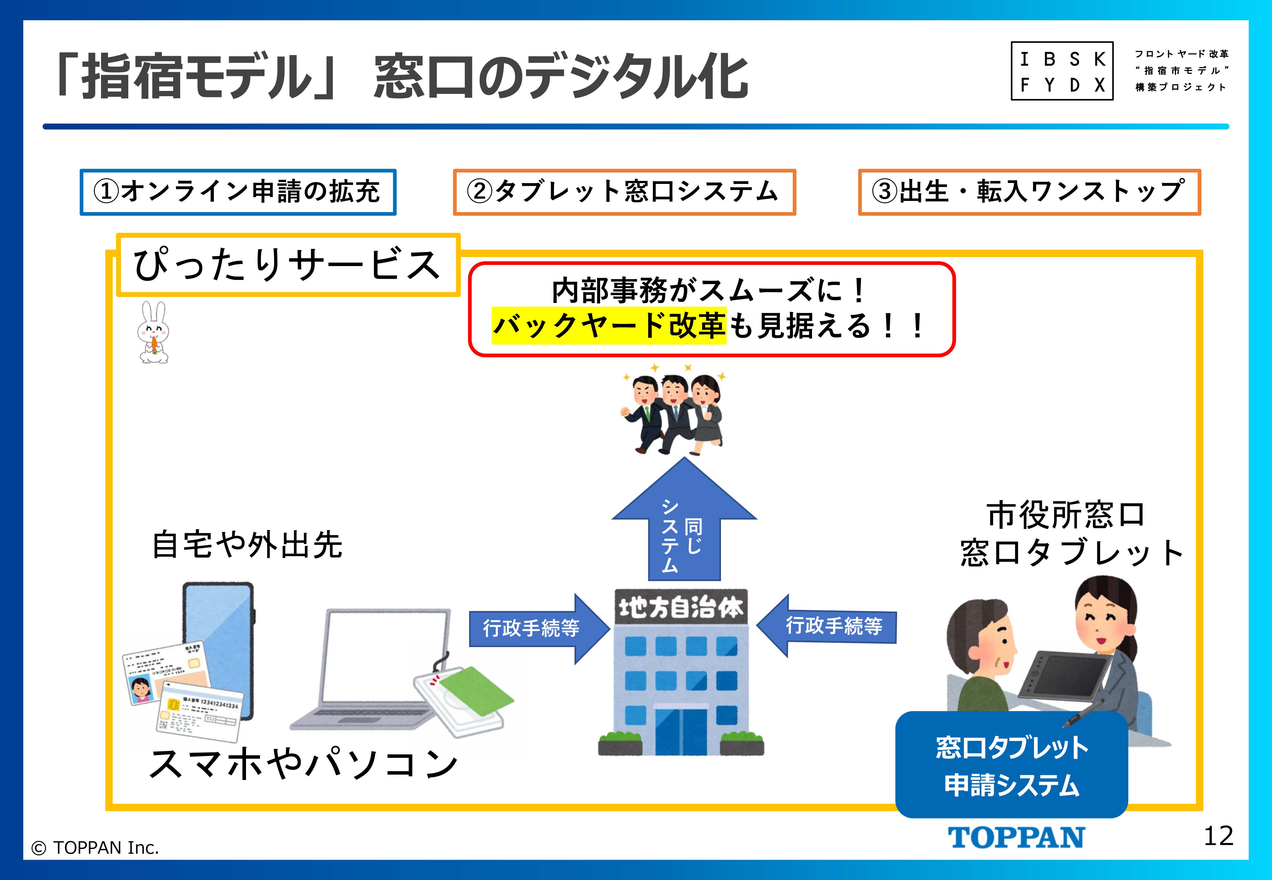 加えて思いついたのが、TOPPANの「窓口タブレット申請システム」を活用し、ぴったりサービスを使ってコストを抑えながら、窓口でのオンライン申請をおこなうことです。さらに、出生・転入ワンストップまでタブレットで申請できるよう構築したので、今後これが進んでいけば、住民対応もスムーズになるのではと思います。