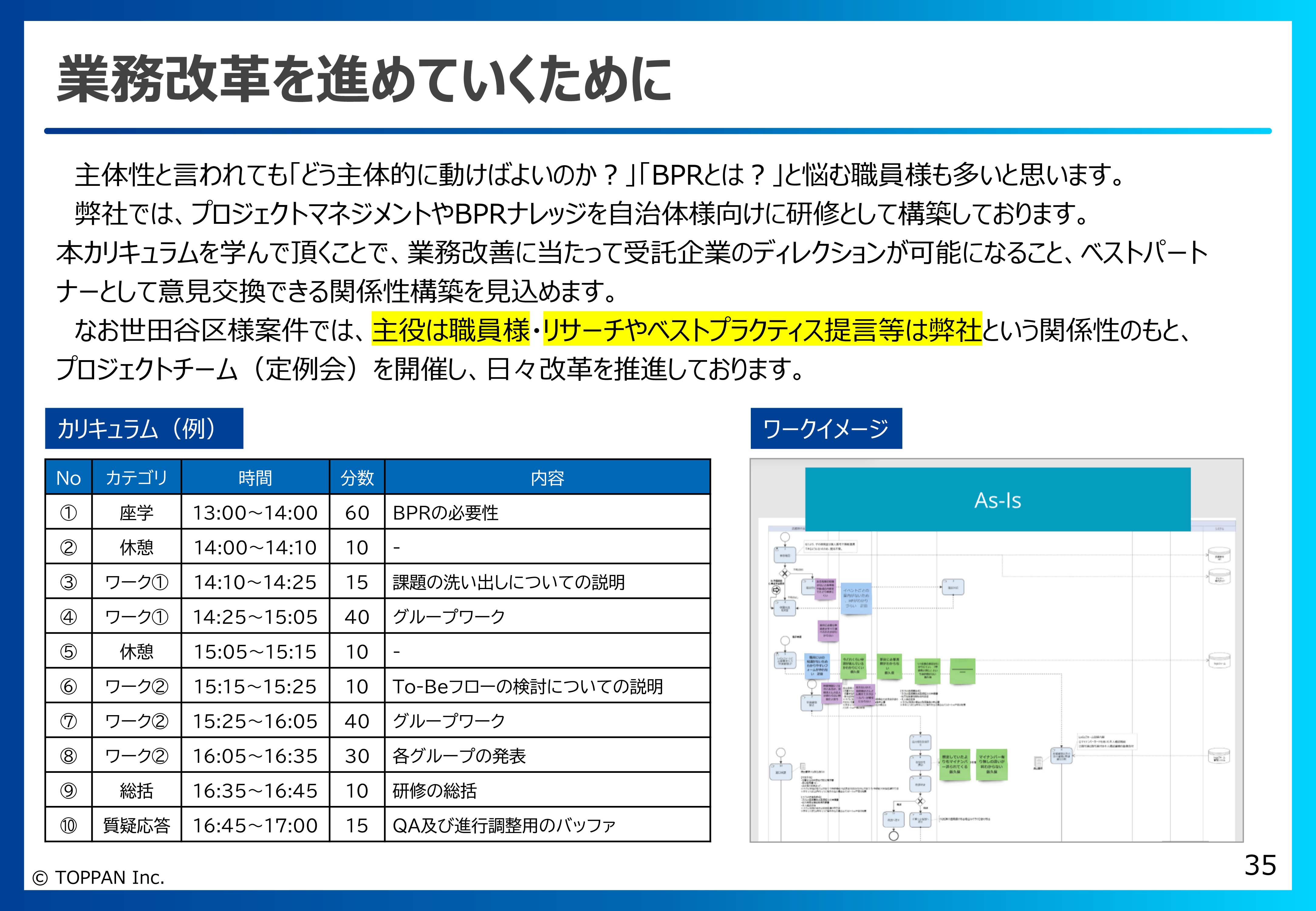 しかし、主体性と言われても、どう主体的に動けばいいのか、そもそもBPRとは?と悩む方も多いかと思います。それに対し、TOPPANではプロジェクトマネジメントやBPRナレッジに関する職員向け研修を実施しています。これにより自治体職員による受託企業のディレクションが可能となり、官民連携でのより活発な意見交換が可能になると考えています。