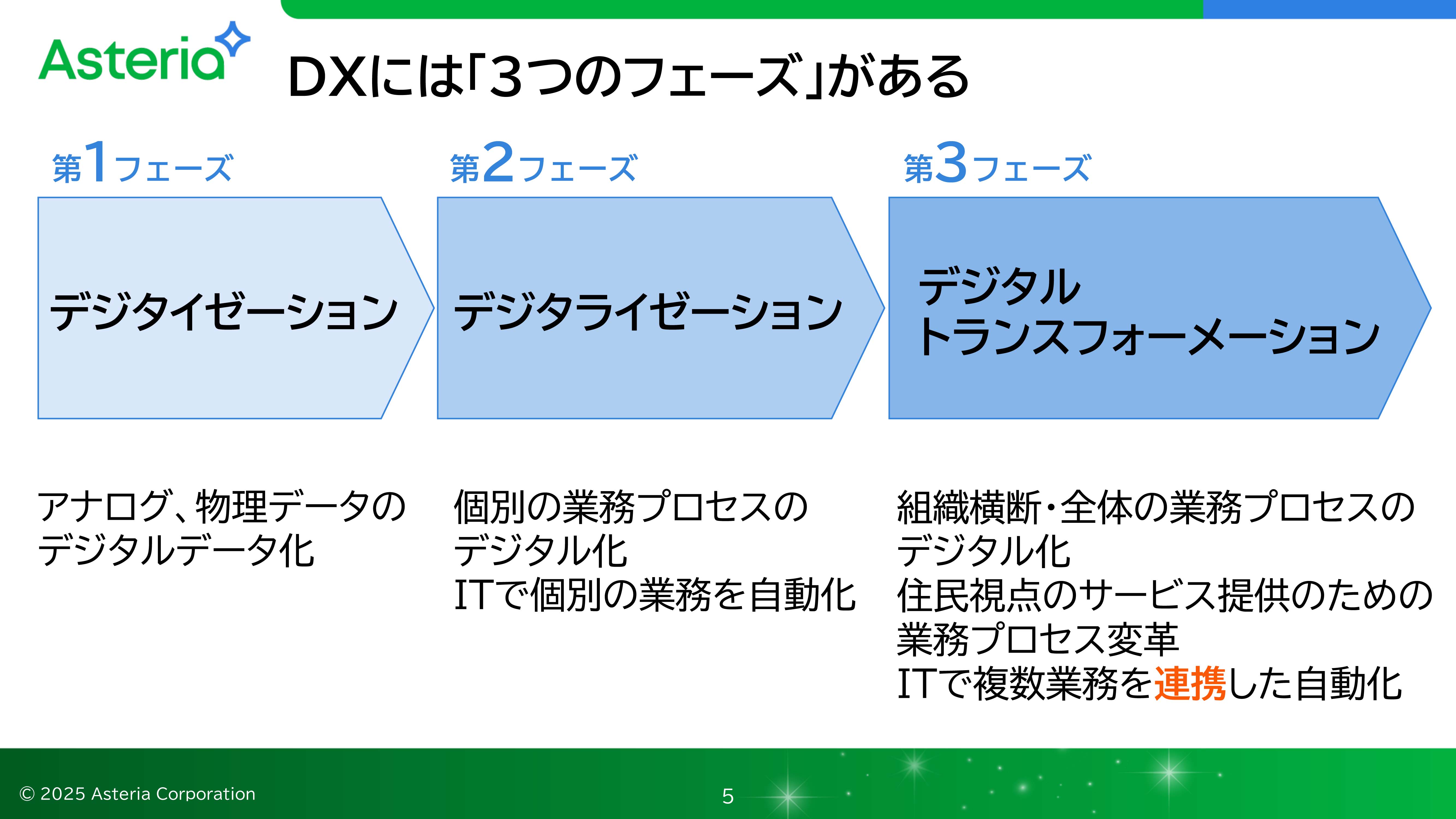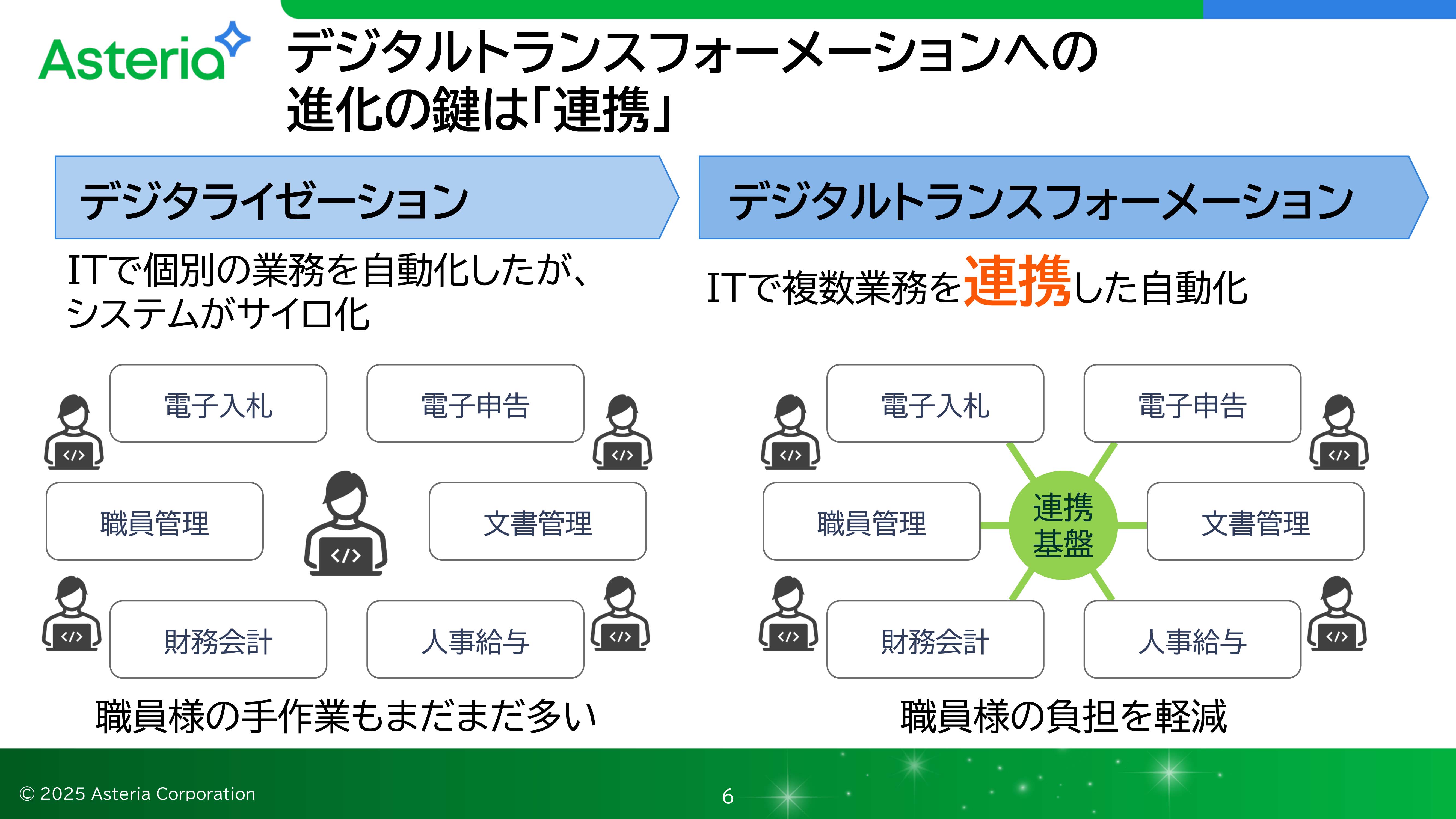 第2フェーズのデジタライゼーションは、ITを使って個別の業務を自動化できた段階です。ただし、業務と業務の間をつなぐ場面で職員の手作業も残されている。これがデジタルトランスフォーメーションに進化すると、ITで複数業務を連携した自動化ができている。職員がやっていた作業が“連携基盤”に置き換わり、全体として職員の負担を軽減することが可能です。さらに業務もスピーディに進み、それによって住民への対応速度が上がるといった改善が図れます。