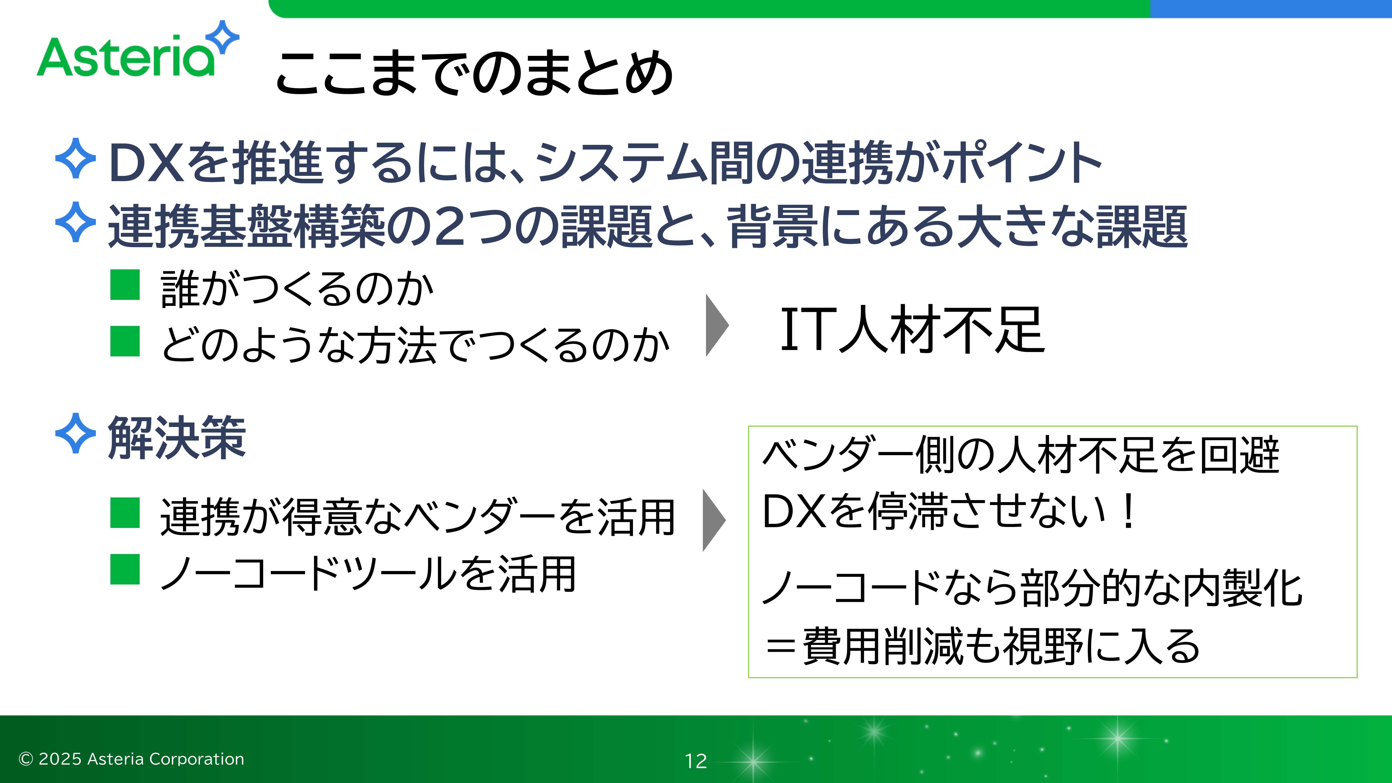 本セミナーの最後は、ノーコードツールを手がける「アステリア」の担当者が登壇。DXの完成に向けて必要な連携基盤の解説と、それを低コスト・短工期で構築する方法について、実例も交えて説明してくれた。