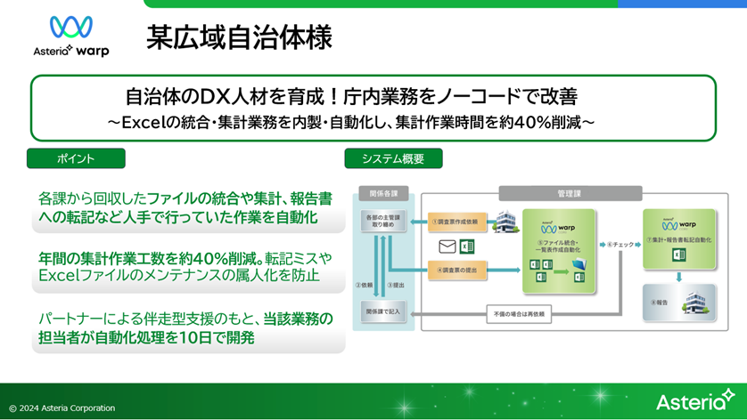 ここからは、当社が提供しているノーコードのデータ連携ツール「ASTERIA Warp(アステリア ワープ)」の自治体導入事例を紹介します。