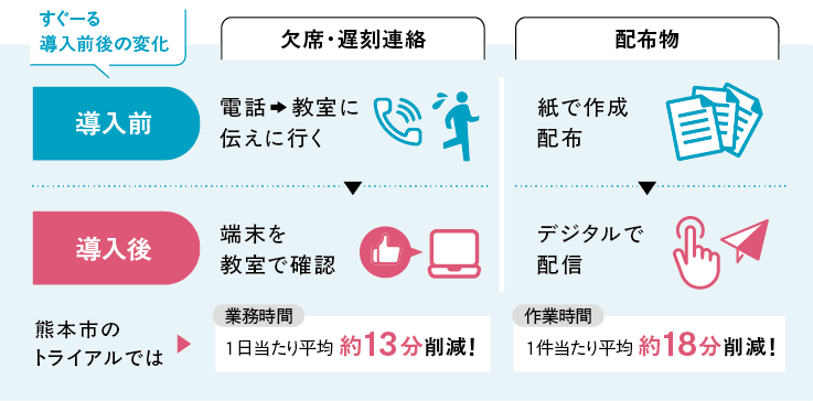 同システムの機能には、連絡帳や欠席・遅刻連絡、おたより配信などがある。従来は主に電話でやりとりしていた欠席・遅刻の連絡は、教員の端末から確認できるので効率的に。理由などの詳細も相違なく伝わりやすくなるという。学校や学級から家庭へのおたよりも、電子化することで印刷・配布の手間がなくなり、子どもが保護者に渡し損ねることを防げるのもメリットだ。本導入に先駆け、市内の教育機関の1割に当たる計14の幼稚園、小・中学校、高校でトライアルを実施。最初の1カ月で、欠席・遅刻連絡にかかる時間は1日当たり平均約13分、プリントの配布は1件当たり平均約18分を削減できたそうだ。