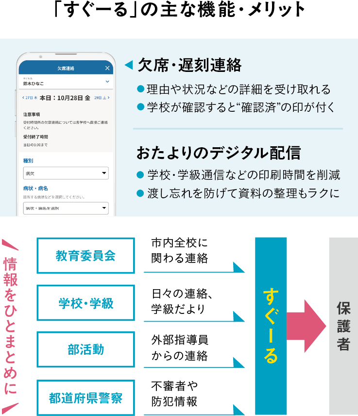 そこで学校と教育委員会が共通で使うことができ、学校関連のやりとりをまとめられるシステムを導入するため、令和5年度にプロポーザルを実施した。その結果、全国での導入実績の多さや災害時のつながりやすさなどから、「バイザー」の「すぐーる」が選ばれたという。同システムは、保護者がアプリを使うことで、学校からのお知らせの受信や、保護者から学校への欠席連絡など、相互連絡が可能に。教育委員会も、情報配信や各校の状況確認ができる。