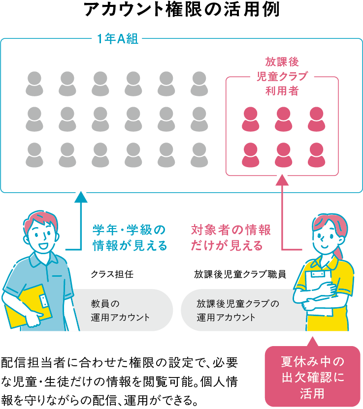 このほか、部活動の外部指導員など校外の協力者にも配信権限を付与できる。同市では放課後児童クラブの職員に権限を付与。夏休みなどの長期休暇中に、個別の出欠確認などをしているという。閲覧する情報や、配信する権限を制限できるため、安心感と使い勝手が好評のようだ。