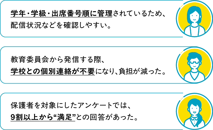 学校で扱う書類も徐々に電子化が進み、配信方法も見直されてきているようだ。「例えば保護者を対象にアンケート調査を実施する際などは、今まで各学校に依頼して、学校から配信してもらっていました。すぐーるを使って教育委員会から一斉配信できるようになったので、先生の負担を減らすことができています」と山口さん。
