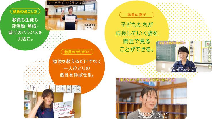 令和7年1月には、新たなコンセプトの動画が完成した。社会人特別選考の枠で転身した人や、他県から転職してきた人、ベテラン教員など多様な人材が出演。子どもたちに伝えたいこと・教員になった理由・休日の過ごし方などについて語っている。民間企業から転身した高校の教員は、小・中学生にスポーツを指導した経験から、「子どもが目を輝かせ、成長できることに携わりたいと決意した」という。小学校6年生を担任する教員は、「子どもたちに今のクラスでの時間を悔いなく過ごしてほしい」と話す。ワークライフバランス編では、休日を家族と過ごしたり、趣味を楽しんだりしているとの声や、就業時間が長くなることもあるが、自分が必要だと思う勉強には自主的に取り組んでいるとの声もある。「新卒はもちろん、ほかにも様々な人に教員を目指してほしいですね。別の職業を経験している人こそ、子どもたちに伝えられることがたくさんあるはず。多くの人の選択肢になればと考えています」。