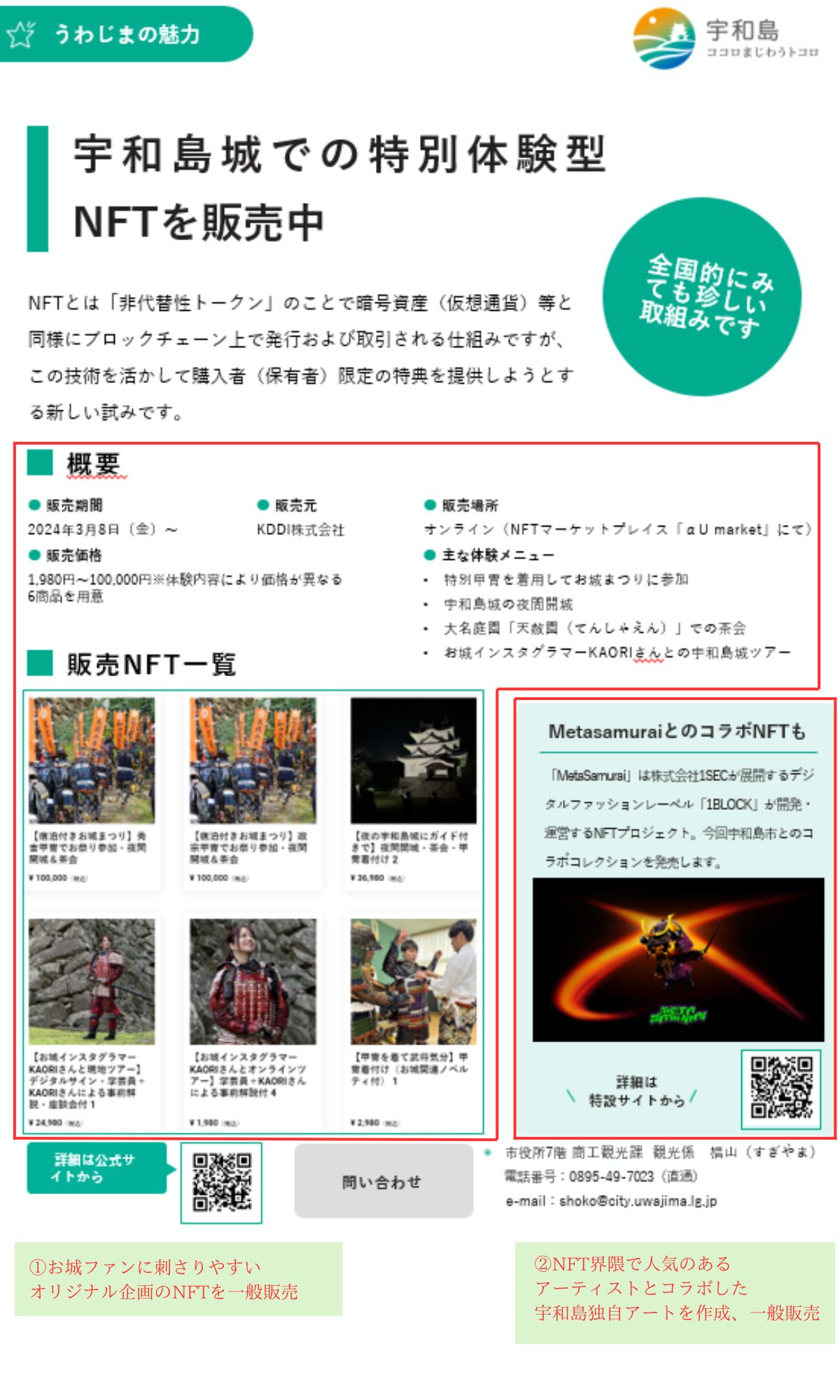 市で取り組んだ概要としては、①マス向け(お城ファン)に刺さりやすいオリジナル企画のNFTを一般販売し、宇和島城関連のリアル来訪特典を付与することで、来訪者の増加を目指すこと。