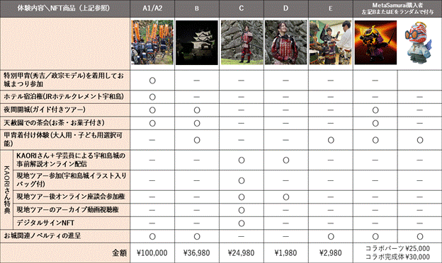 KDDI社が販売するそれぞれのNFT(A~E)は付与される特典ごとに値段が異なる。特別甲冑体験を含むA1/A2については、100,000円といった具合いだ。