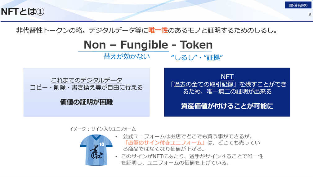 NFTの仕組みを取り入れたねらいとしては、購入を契機に、地域への来訪を促し、地域のファンとなるきっかけを提供したいと考えたためである。コピーが可能なデジタルな世界において、NFTを利用することで唯一無二である事を証明できるようになった。デジタルアートをはじめ、ゲーム、音楽、スポーツ、今回のようなコト体験など、様々な分野で使われ始めており、他団体においても、このような取組みが、新しい地域共生のチャンスを生み出す可能性をもっていることについて、認識いただければ幸いである。